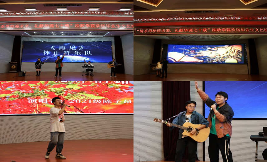 大四刘岩同学带来的歌曲《那些年》和大四韩雨彤同学带来的歌曲《青春不打烊》将所有同学的记忆拉回初入校园的秋天,呼唤起全体同学对校园生活的美好回忆。迈着胜利的步伐,河北地质大学一路自强不息,求实创新;七十年沧海桑田,桃李争艳,河北地质大学一代代毕业生身处华夏大地的不同坐标不断续写精彩篇章。由2020级和2021级同学带来的朗诵《永远张扬,永远满怀理想》,《栉风沐雨七十载,春华秋实谱新篇》,展示了法政学子矢志不渝的奋斗青春底色,表达了全体同学对母校七十华诞的真诚祝愿,以及愿同河北地质大学同高歌,共风雨的美好愿景。而后,2023届优秀毕业生代表钮雅琴上台发言,她感念师恩,感恩母校,她表示:“全体毕业生将带着母校的期待,老师的教诲以及同学间的情谊,继续砥砺前行,做怀揣梦想、脚踏实地的人,以青春之名,赴时代之约。”随后,大四李秋雨同学带来的歌曲《十年》,大二王晓蕊同学的沙画表演,休止符乐队带来的歌曲《再见》,大四马思骋同学的说唱《日出》以及大二陈子昂同学带来的歌曲《凤凰花开的路口》不断引得全场的如雷般的掌声和热烈欢呼。一首首充满校园气息的歌曲,一场场精彩绝伦的演出,让此次欢送毕业生文艺汇演的氛围达到高潮。栀子花开的季节,挥手分别的时刻,汇演的最后由公司领导、老师、毕业生以及在校生共同合唱《栀子花开》,表达了2023届毕业生对母校情谊和师恩难忘的依依不舍。