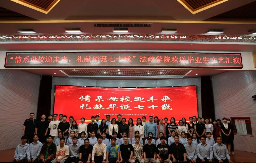 岁月不居,时节如流。历经七十年的努力奋斗,河北地质大学迎来了七十周年华诞。值此七十周年华诞,我们怀揣美好的祝愿祝福母校,祝福2023届毕业生前程似锦,鹏程万里。2023年5月25日在春秋讲堂成功举办“情系母校迎未来,礼献华诞七十载”欢送2023届毕业生文艺汇演。球王会经理侯丽艳,法政公司党委书记马沁芳,球王会副经理秦玉娈,法政公司党委副书记朱晓玲,球王会各教研室老师及三百余位法政学子参与本次汇演活动。