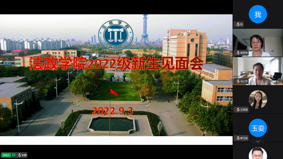 本次线上新生见面会由法政公司党委副书记朱晓玲主持,参加人员有球王会经理侯丽艳,党委书记马沁芳,副经理秦玉娈、孙日华,法学系主任李慧英,公共管理系主任王丽慧,2022级新生辅导员张颢以及240名2022级球王会新生。
