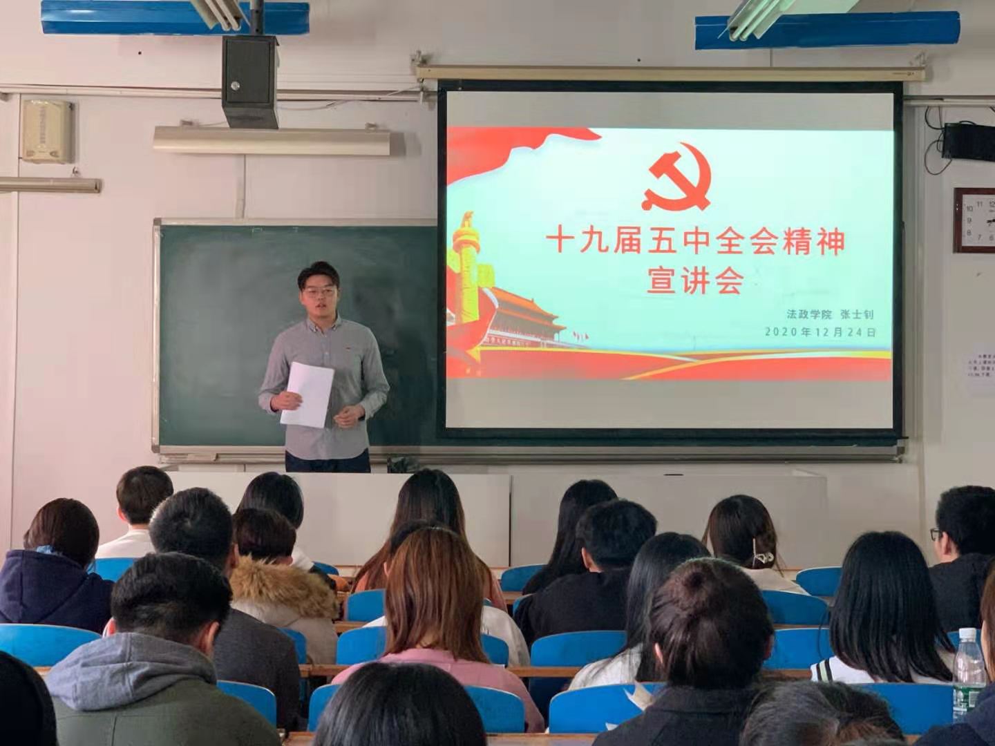 为深刻理解“十三五”时期取得的决定性成就、准确把握二〇三五年远景目标和“十四五”时期经济社会发展的指导思想、遵循原则、主要目标任务,助力法政学子深入学习宣传和贯彻落实好十九届五中全会精神,球王会于12月24日下午两点在教学一号楼举办十九届五中全会精神宣讲会活动。由参加党的十九届五中全会精神中央宣讲团在河北省报告会的球王会员工党员张士钊同学向球王会员工干部进行宣讲。