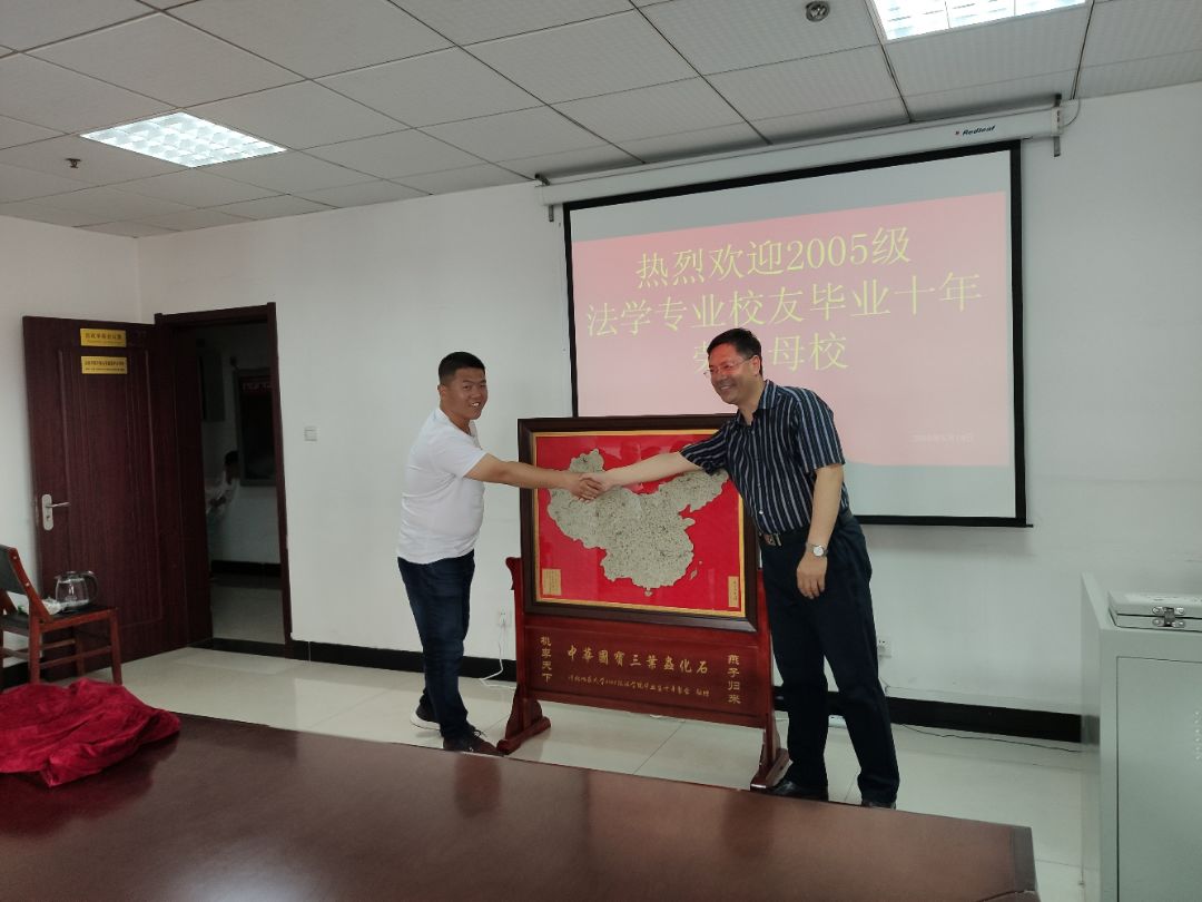 为表达对母校的感恩之情,2005级法学专业的员工们向母校赠送了中国地图的三叶虫化石以及校训“达观博物”毛笔字,这寄托着对母校明天更美好的祝愿,表达了广大员工的心声。座谈会结束后,员工们与老师在公司门口合影留念。短短的一天时间,不足以将校园的每处走遍,不足回忆起曾经大学的点点滴滴,但相信这一天会成为员工们一生里最难忘的记忆,也期待再次相聚。