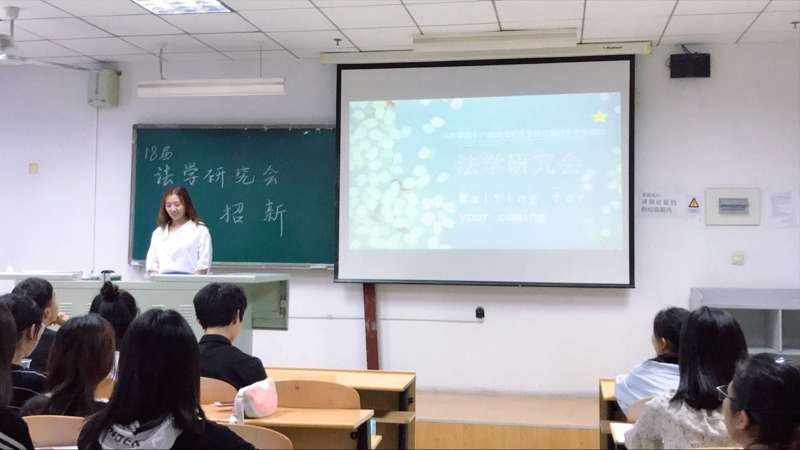 大会正式开始,主持人致开场白,依次介绍到场嘉宾。大会首先由法研陈轩主席致开幕词,简明扼要的介绍了法学研究会的主要工作及发展方向,并进行动员工作,鼓励大家踊跃报名。接下是法学研究会四个部门的部长向2018级新生详细介绍各部门的职责及日常工作,展现各部门的特色风采。大会最后由法研主席田馨舒进行总结发言,并宣布法研招新大会圆满结束。