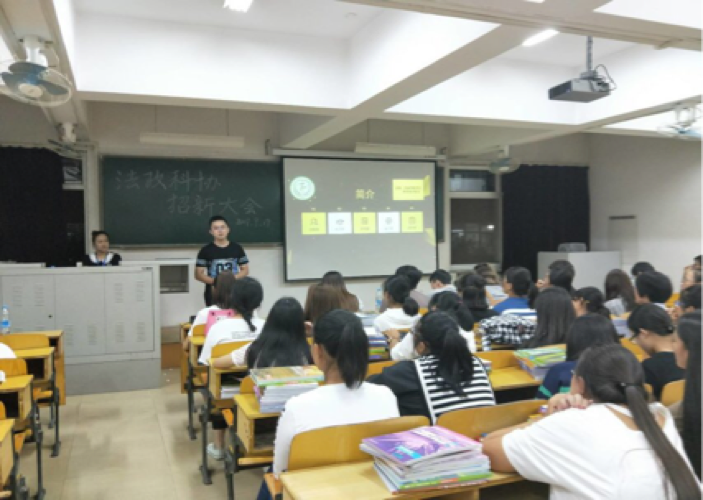 纳新活动开始,首先由主持人致开场白,介绍到场嘉宾,宣布法政科协纳新大会正式开始。由法政科协主席刘妍佳致开幕词,主席激情洋溢的发言极大的振奋了同学们的心情,并通过播放法政科协的纳新视频,活跃了现场的氛围。充分向18级新生展示了法政科协是一个团结、友爱的大家庭!紧接着各部门部长按照顺序进行宣讲。部长们各具特色的发言不仅展示了各个部门的魅力,更体现了法政科协的协会文化以及科协内部的氛围,在团结中进取,在乐趣中前行!同学们都积极踊跃地报名自己心仪的部门,填写工作人员发的纳新志愿表。最后由副主席张廷进行总结并宣布法政科协纳新大会圆满结束。